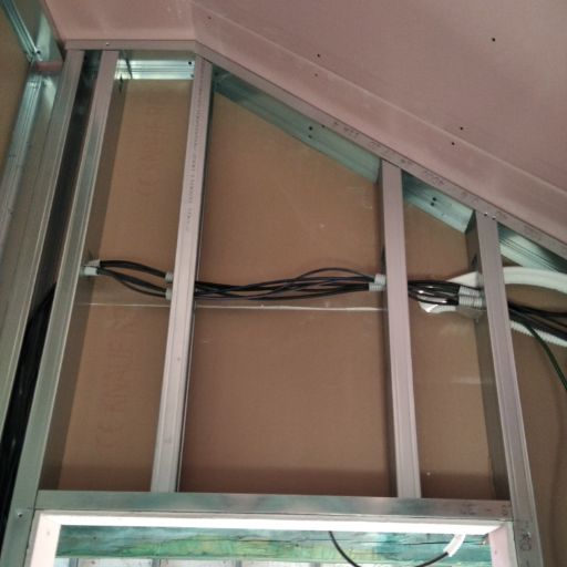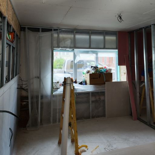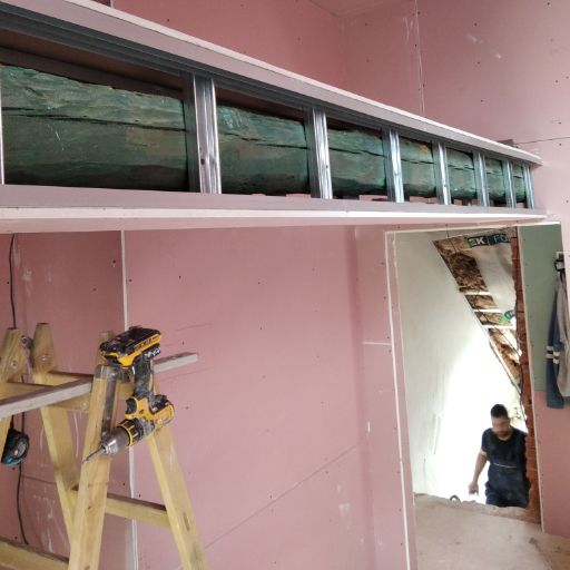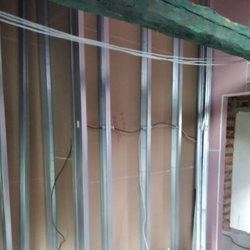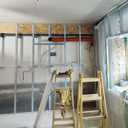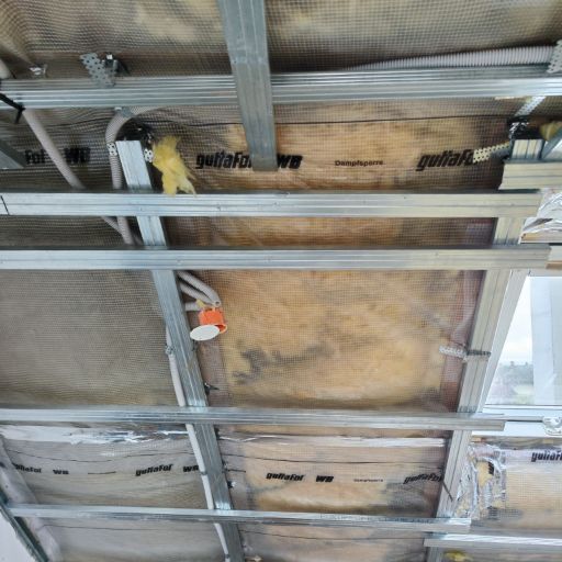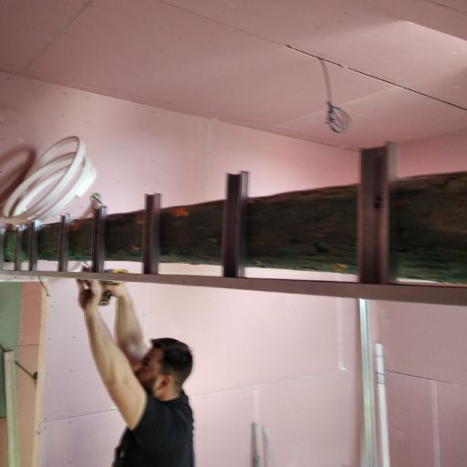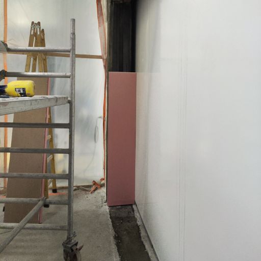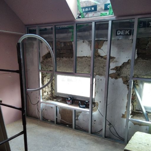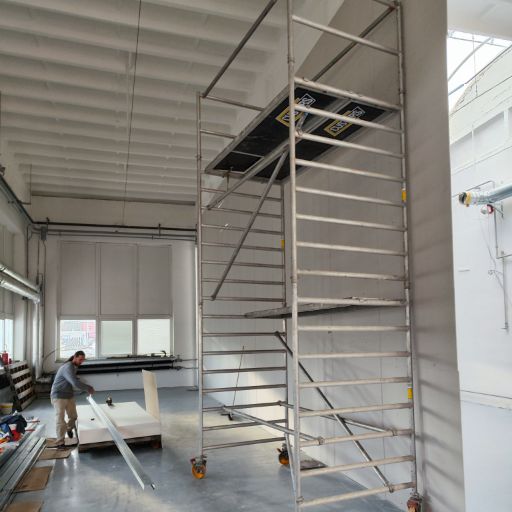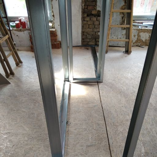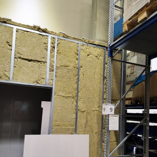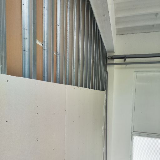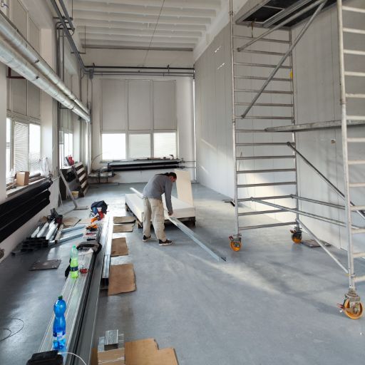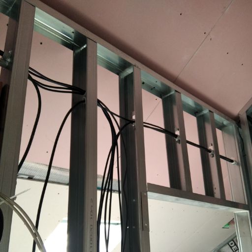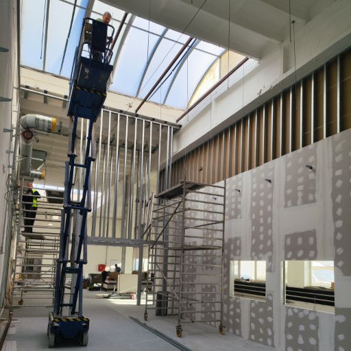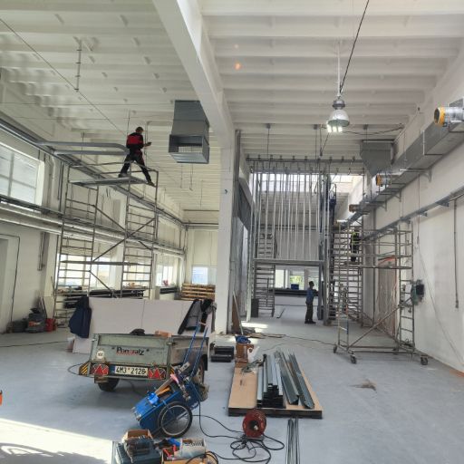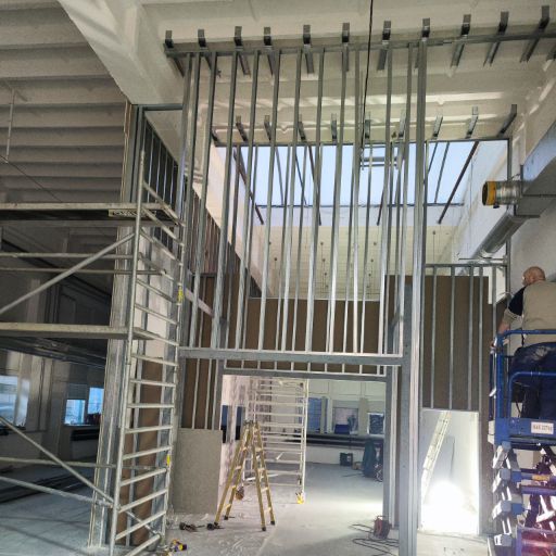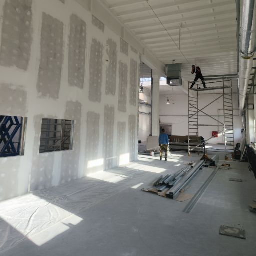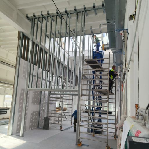 Výstavba dělících příček v hale oddělující jednotlivé výrobní procesy. Vysoké konstrukce ze sádrokartonu nejsou překážkou.